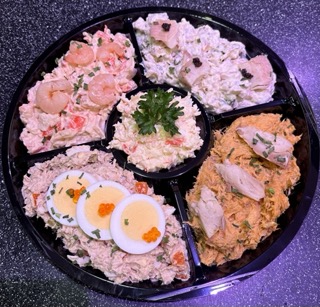 Schotel met onze huisgemaakte salades: Noordzee-salade, Tonijn Nicoise, Makreel Americain, Gerookte Forelsalade en Zalm-Ei salade